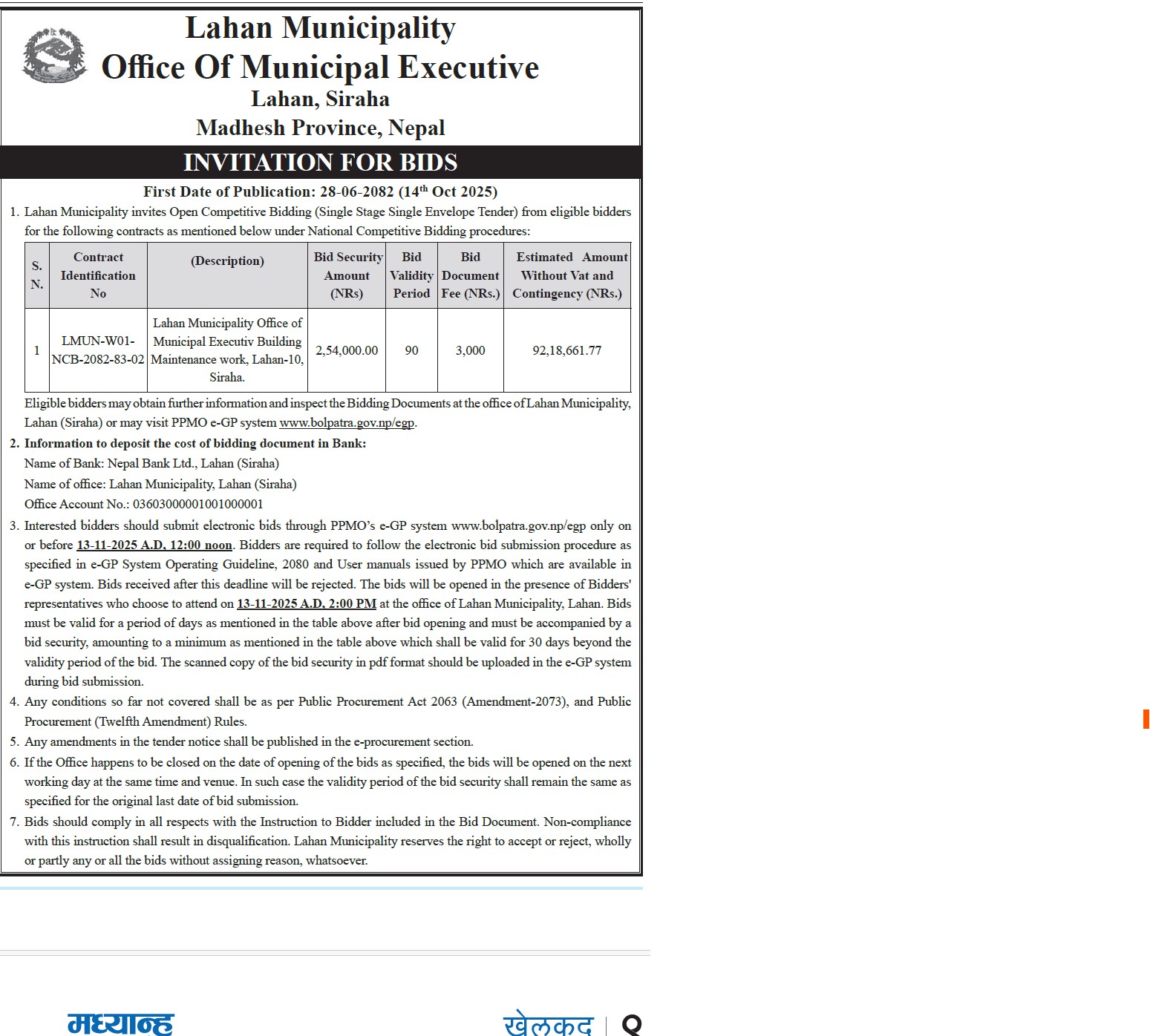 Invitation for bids about Lahan Municipality Office of Municipal Executive Building Maintenance work, Lahan - 10, Siraha. (14th oct 2025).