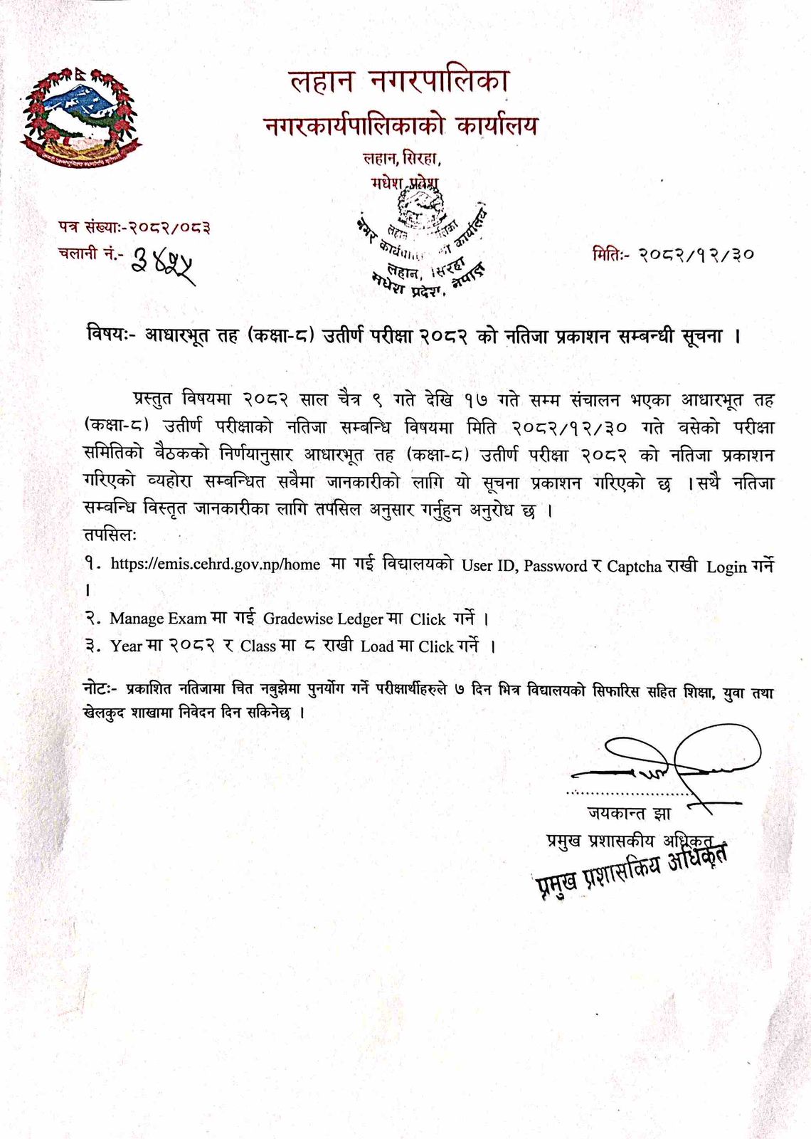 आधारभूत तह (कक्षा-८) उतीर्ण परिक्षा २०८२ को नतिजा प्रकाशन सम्बन्धी सूचना।