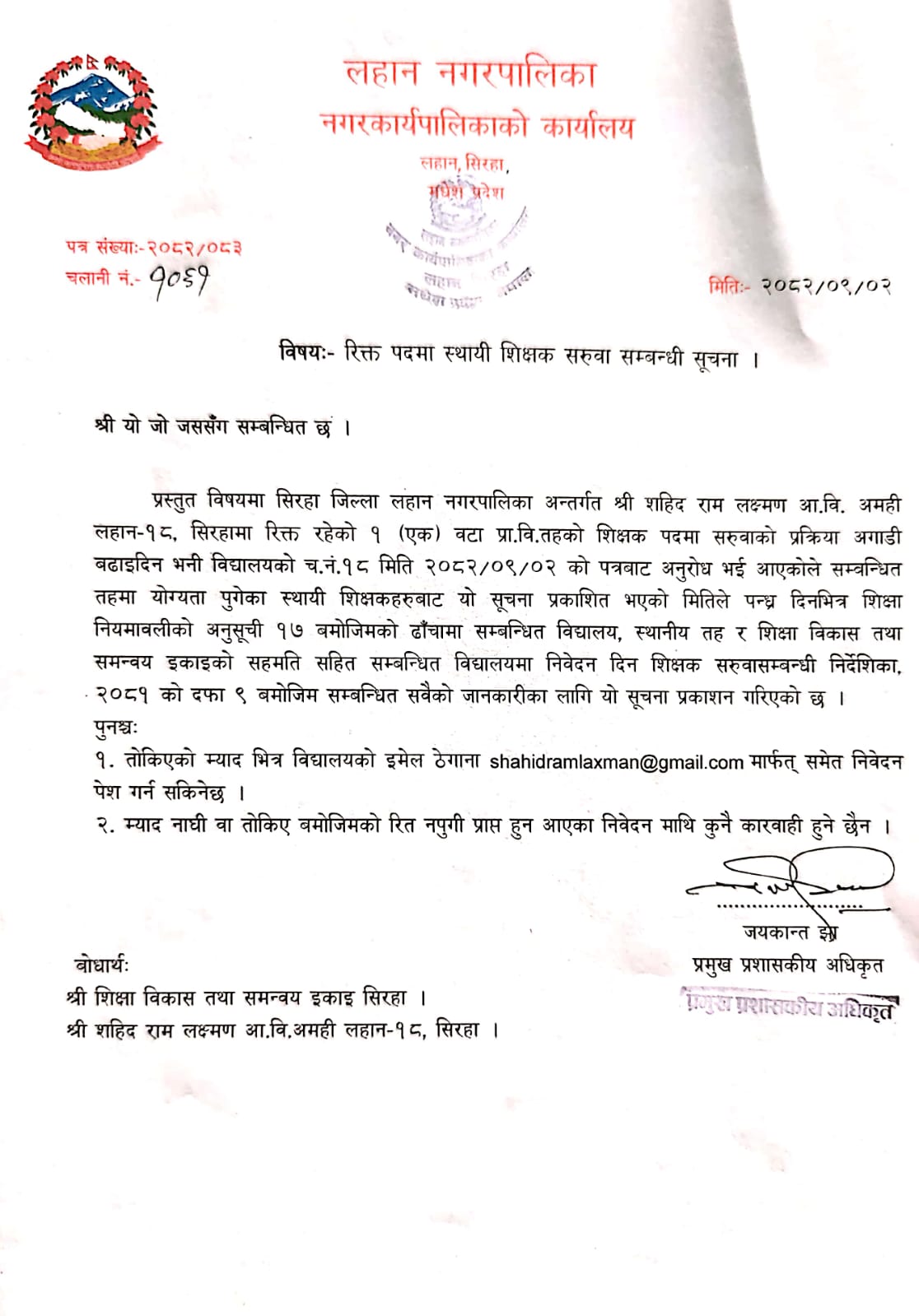 » रिक्त पदमा स्थायी शिक्षक सरुवा सम्बन्धी सूचना (२०८२-०९-०२)।