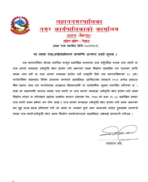 ल.न.पा. भित्र घर नक्सा पास / अभिलेखिकरण सम्बन्धि अत्यन्त जरुरी सूचना।