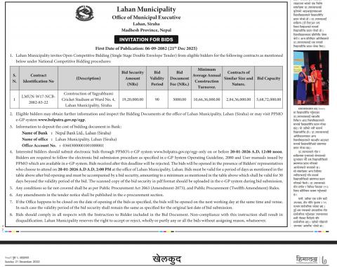 » Invitation for Bids ( Construction of Yagyabhumi Cricket Stadium at Ward No. 4, Lahan Municipality, Siraha)