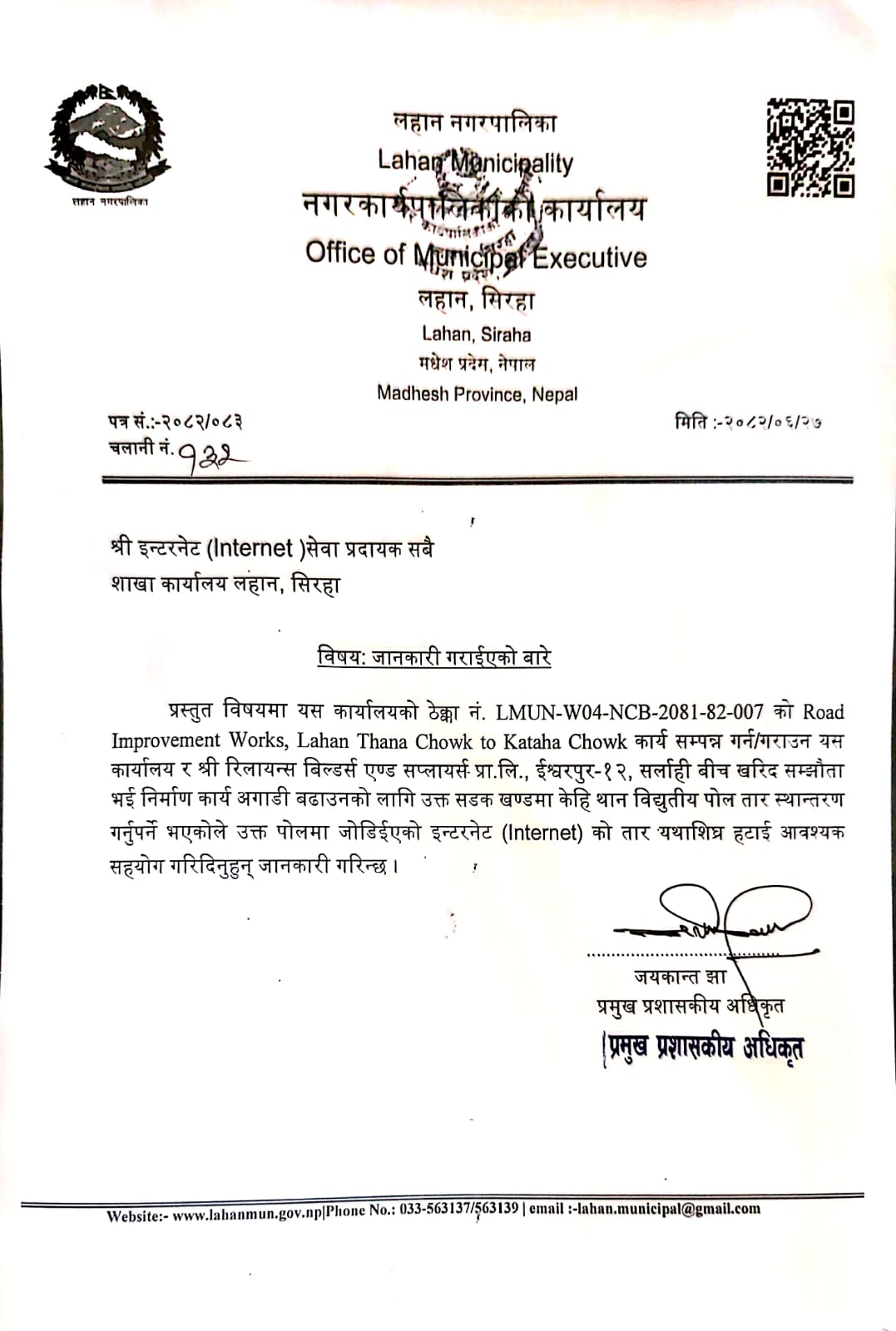 ठेक्का नं.LMUN-W04-NCB-2081-82-007 को Road Improvement Works सम्बन्धी श्री इन्टरनेत (Internet) सेवा प्रदायक सबैलाई जानकारी गराईएको बारे