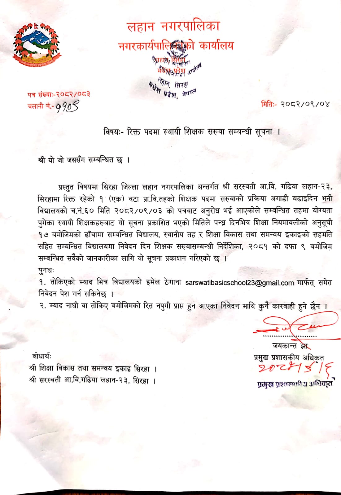 रिक्त पदमा स्थायी शिक्षक सरुवा सम्बन्धी सूचना - श्री सरस्वती मा. वि. गढिया लहान-१३, सिरहा।